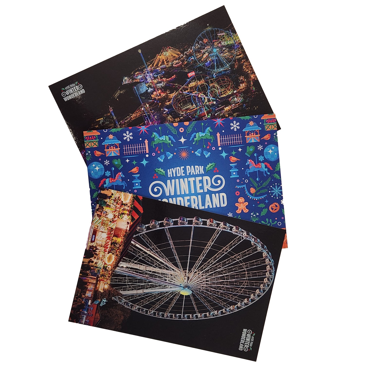 Capture the magical moments of Winter Wonderland Hyde Park in this set of 3 postcards. Designs include the iconic and much loved ferris wheel, an aerial view of Winter Wonderland by night, and the new festive design which features cute little robins, tasty gingerbread men and yummy pretzels amongst sweet candy canes, bells, sleighs and Christmas trees.